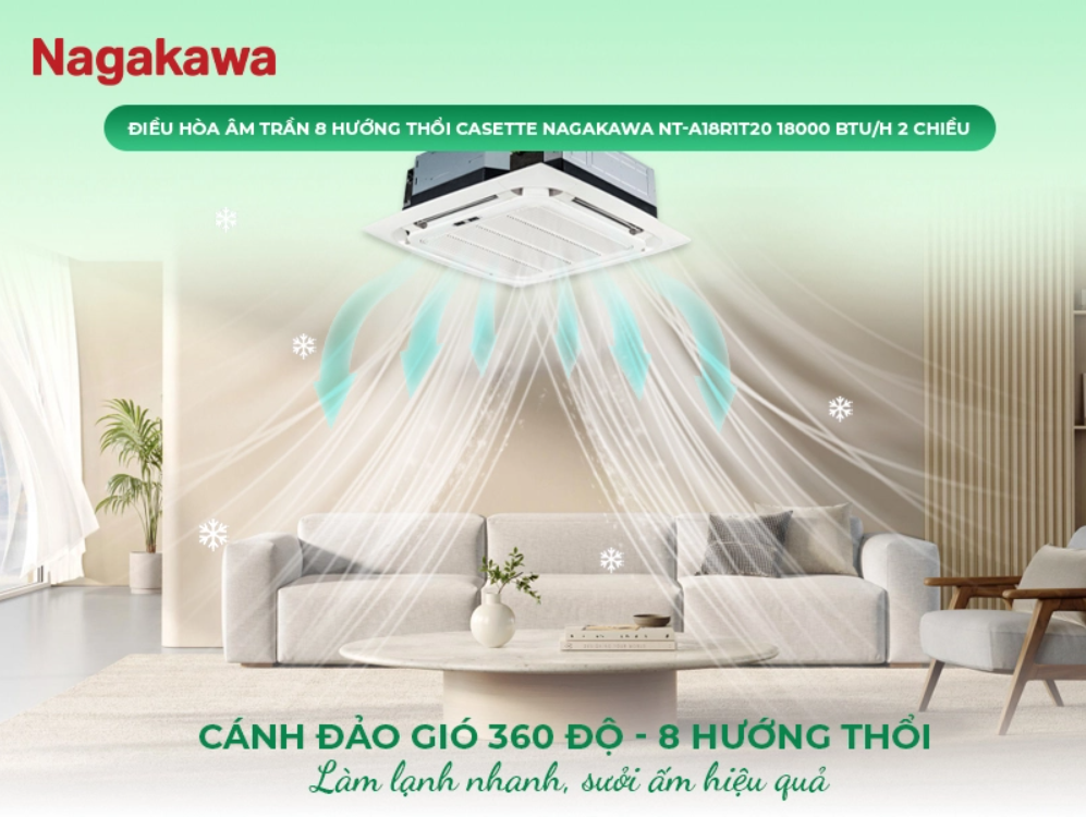 Máy lạnh âm trần Nagakawa là dòng điều hòa cassette cao cấp được lắp âm trần giả, mang lại thẩm mỹ cao, luồng khí phân bố đều 360° và hiệu quả làm lạnh/sưởi linh hoạt.